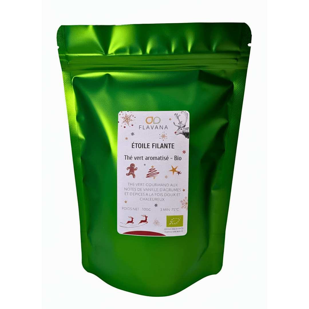 Sur une base de thé vert, Étoile Filante est une référence emblématique des thés de Noël. Ce Sencha associe des notes naturellement rafraîchissantes à des arômes de vanille, d’agrumes et d’épices à la fois doux et chaleureux. À la dégustation, la note dominante d’orange est adoucie par la vanille, et le clou de girofle apporte un léger piquant, pendant que la cardamome se fait discrète, tel un fil rouge de douceur.